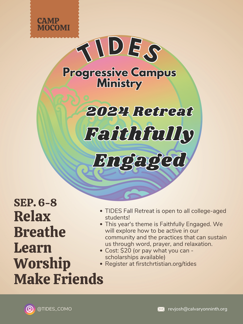 TIDES Fall Retreat is open to all college-aged students! This year's theme is Faithfully Engaged. We will explore how to be active in our community and the practices that can sustain us through word, prayer, and relaxation. This year's fall retreat will be from Friday, September 6 - Sunday, September 8 at Camp MoCoMi. The cost of the retreat is $20, or pay what you can (Note: scholarships available, see the registration form).